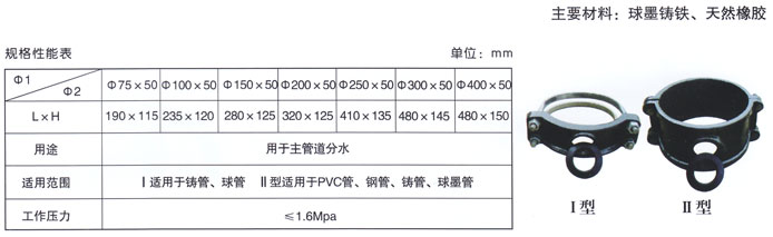 分水卡子用于主管道嫁接分支管道。主要材料:球墨鑄鐵,天然橡膠。適用管道:國(guó)標(biāo)球墨管,鑄鐵管,國(guó)標(biāo)PVC管,PE管。工作壓力:≤1.6MPa。